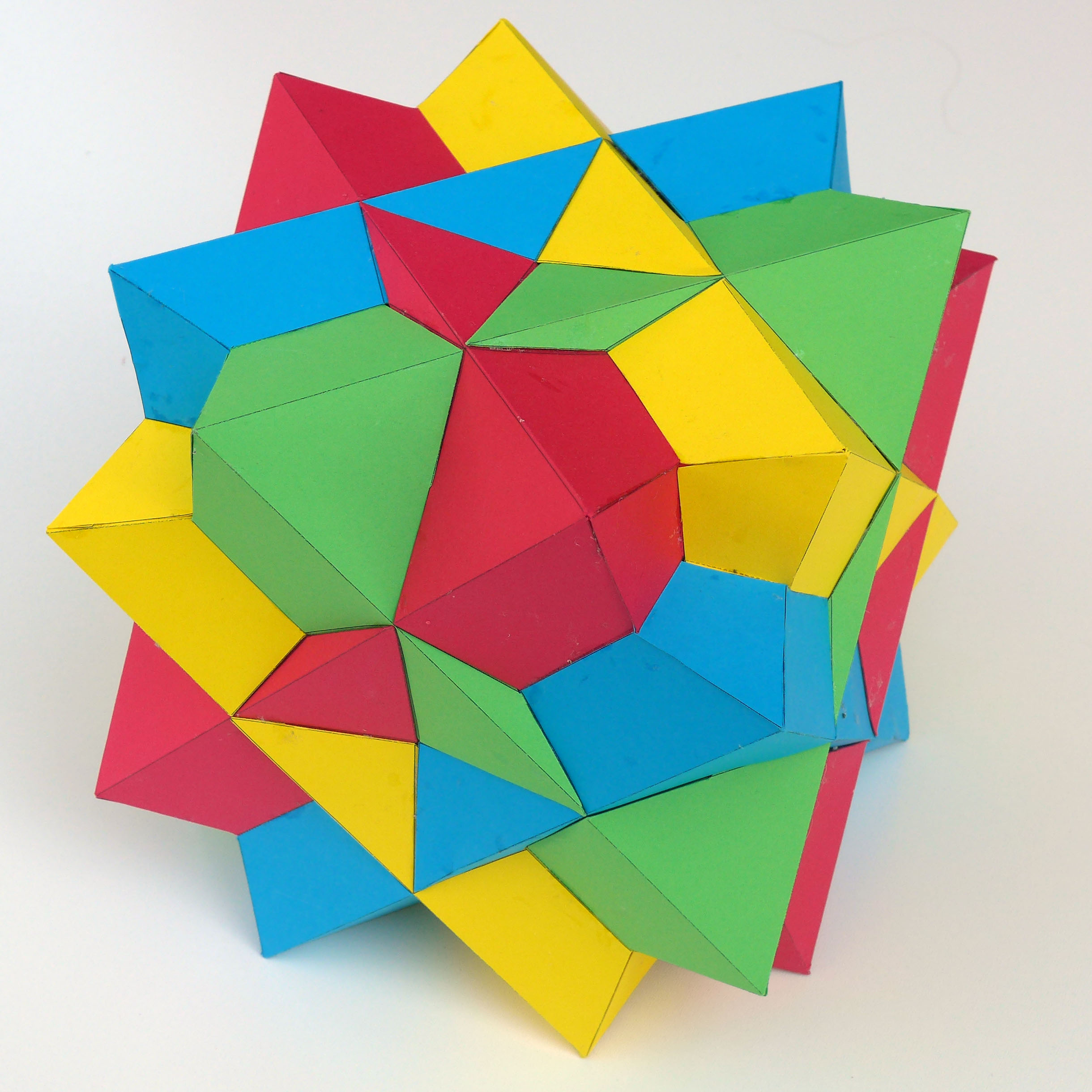 Die vier Ecken des Tetraeders passen genau in vier der 20 Ecken eines Dodekaeders. Deswegen sieht ein Körper aus fünf einander durchdringenden Tetraedern so ansehnlich aus: Seine Ecken sind genau die Ecken eines Dodekaeders. Zugleich hat er einen gewissen frechen Drall, denn er gleicht nicht seinem Spiegelbild.